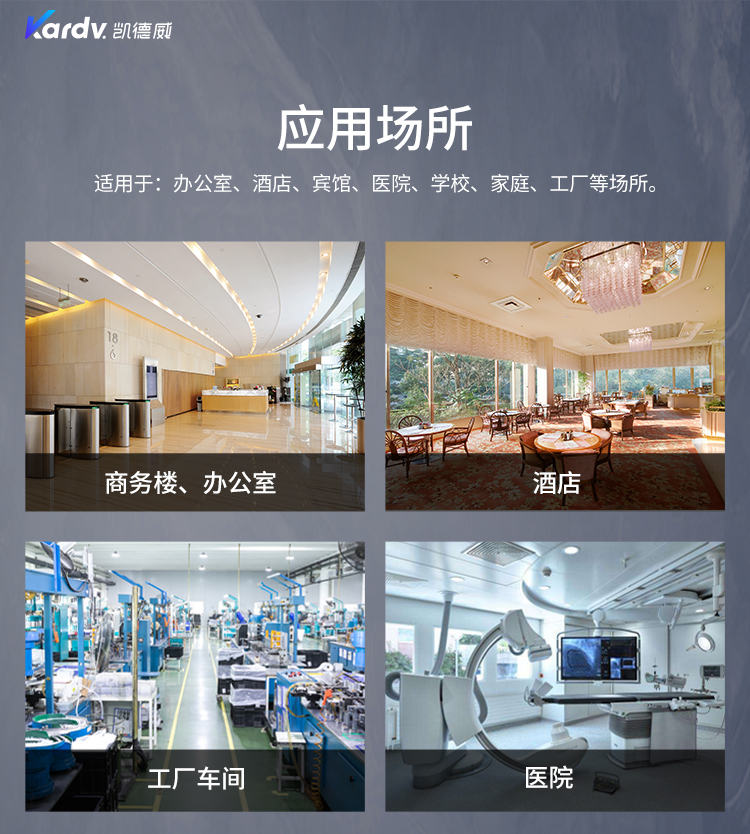 可以用在酒店客房、办公室、写字楼也可以用在普通的商企环境等需要安静的场所使用